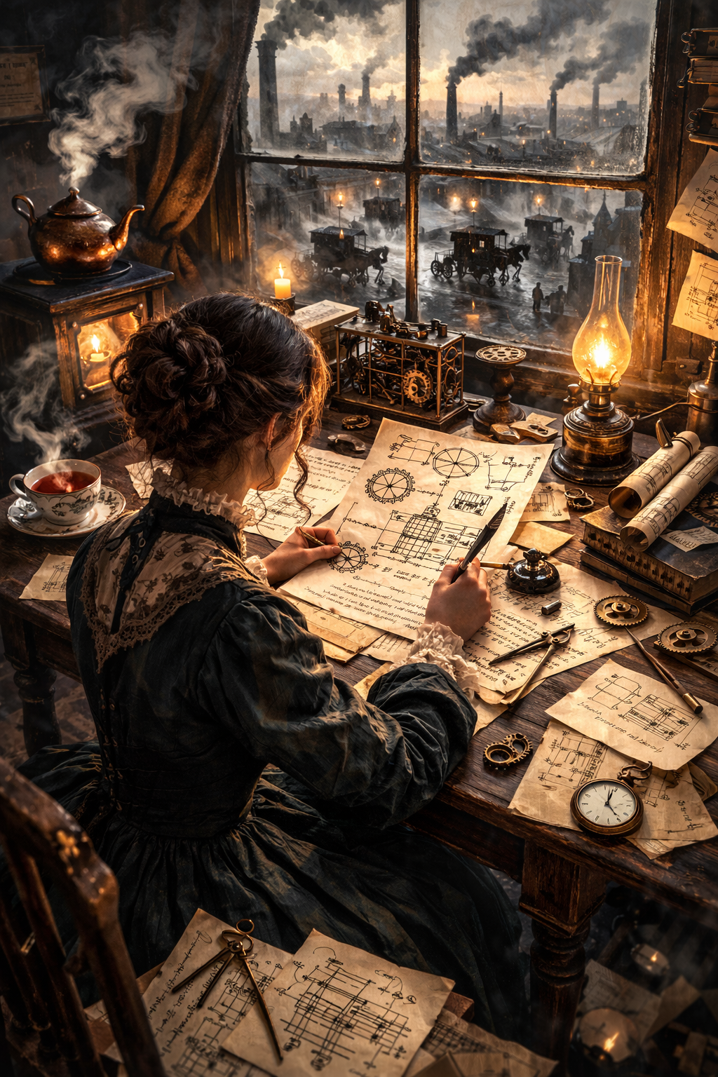 Fuori dalla finestra il cielo è spesso di fumo. Le ciminiere disegnano colonne scure sopra i tetti. Le carrozze sollevano fango lungo le strade. Il rumore è ferro su ferro, zoccoli e ruote.